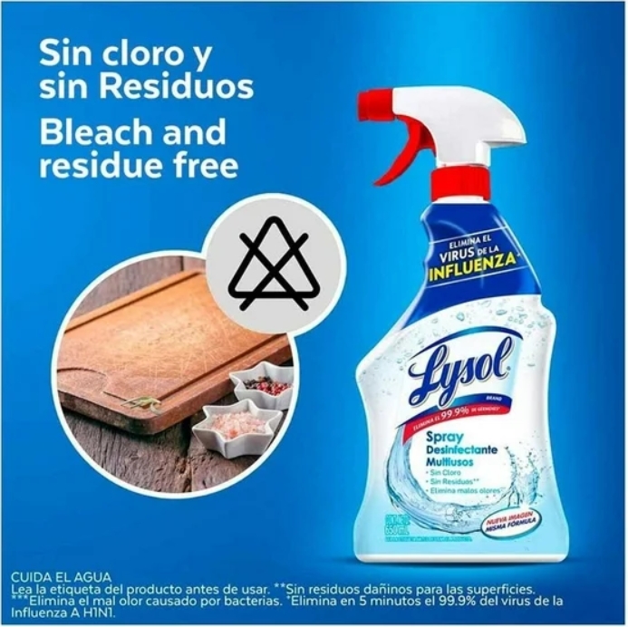 Lysol Spray Desinfectante Multiusos es una forma efectiva y fácil de limpiar y desinfectar su hogar. Lysol Spray Desinfectante Multiusos puede ayudarle a proteger a su familia eliminando el 99.9%* de gérmenes que pueden encontrarse en las superficies de su hogar. – Elimina el virus de la Influenza* – No contiene blanqueador, no mancha. – Ayuda a eliminar malos olores causados por bacterias. – Sin residuos daniños para las superficies. *Efectiva desinfección que elimina bacterias como: E. coli, S. aureus, L. monocytogenes, C. jejuni, P. aeruginosa, S. aureus – MRSA y S. enterica en 5 minutos. **Virus: Influenza A (H1N1) en 5 minutos. Use este producto y obtenga como resultado una limpieza profunda. Recuerda que ya puedes realizar compras de éste y otros productos en tu tienda en línea donde encontrarás lo necesario para tu día a día o para surtir tu despensa. Compra lo que necesites ya que, con nuestro servicio de entregas a domicilio, tus compras llegarán hasta la puerta de tu hogar.